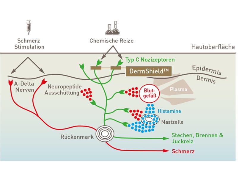 Wenn hoch konzentrierte Wirkstoffe wie Retinol, Milchsäure und Azelainsäure, die in vielen Hautpflegeprodukten enthalten sind, mit der Haut in Kontakt kommen, werden Nervenfasern vom sogenannten Typ C Nociceptors aktiviert. Ebenso erfolgt diese Aktivierung bei Peeling-Behandlungen mit hohen Säurekonzentrationen. Infolgedessen werden neurogene Entzündungen ausgelöst. Kapillare erweitern sich und verursachen Rötungen und Ödeme entstehen durch Flüssigkeitsansammlungen im Interstitium. Ebenso werden Mastzellen aktiviert, die Histamin freisetzen. Dieser Impuls setzt sich über den Spinalkanal in das Gehirn fort und verursacht die Empfindung wie Stechen, Brennen und Juckreiz. Wenn Peelings und Hautpflegeprodukte mit DermShield™ (Patent angemeldet) verwendet werden, wird die Aktivierung der Nociceptoren des Typs C reduziert.